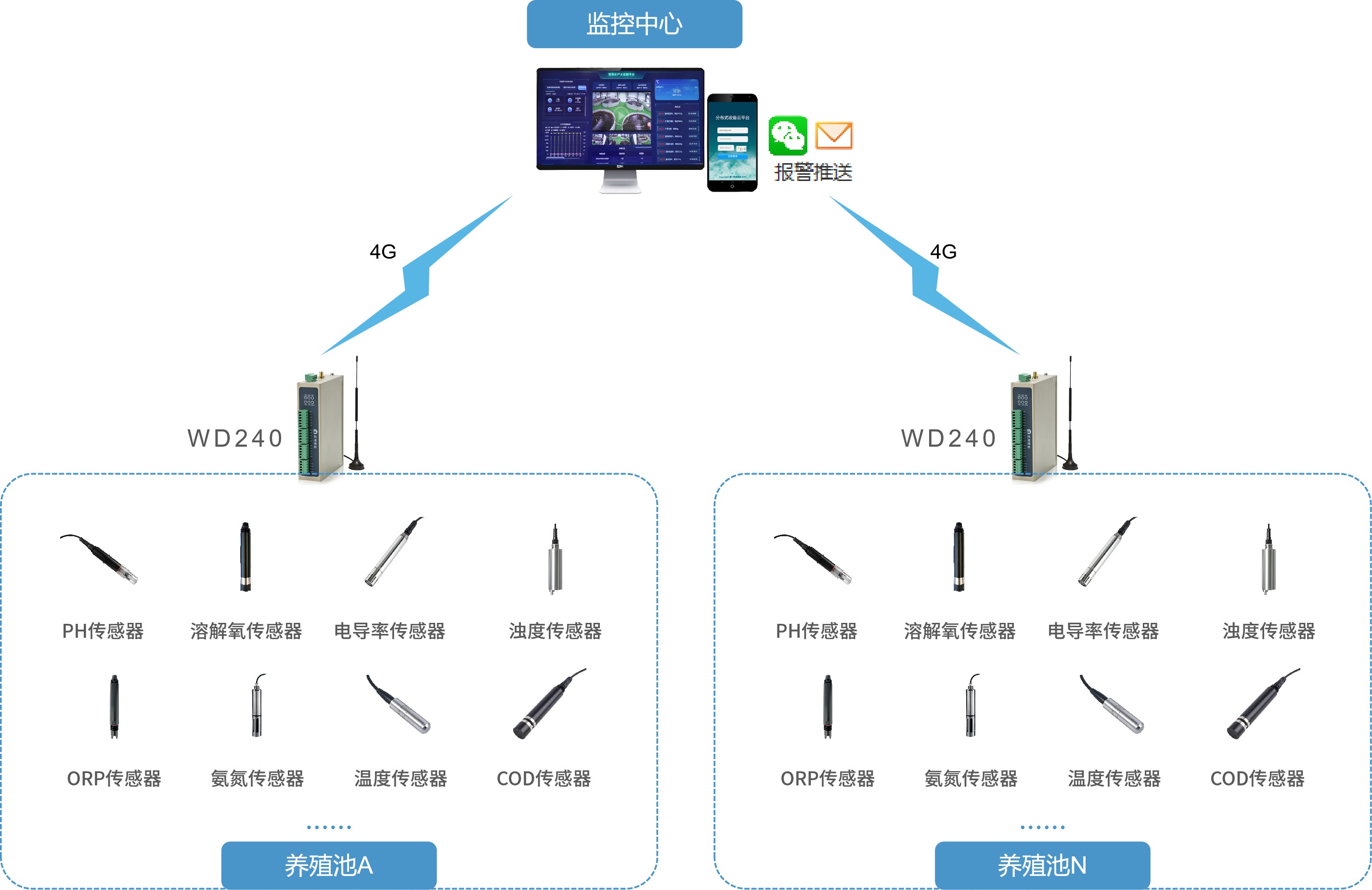 WD240数据采集终端具备多路IO数据采集和一路RS323/RS485串口,能够接入温湿度传感器、pH值传感器、溶解氧传感器等设备,实时采集水质参数对接到智慧养殖管理平台。